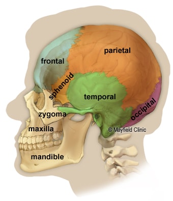 هدف و کارکرد جمجمه (Skull)، حفاطت از مغز انسان و جلوگیری از هرگونه آسیب مغزی است. جمجمه از ۸ استخوان که در کنار هم قرار گرفتهاند تشکیل شده، این استخوانها عبارتند از: